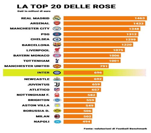 根据其最新的12月版本评估,国际米兰全队估值为6.96亿欧元,接近7亿欧元,在全球范围内排名第11位,在意大利俱乐部中位列第一。作为对比,尤文图斯为6.59亿欧元,AC米兰5.02亿欧元,那不勒斯4.94亿欧元,均进入欧洲前20。