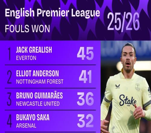 本赛季英超被犯规榜:格拉利什45次第一、萨卡32次第四 -